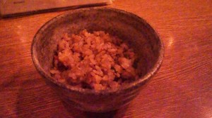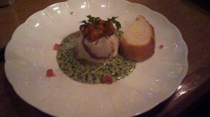 このお店は、平成12年から平成18年まで6年半ほどの間、私が茨木市に住んでいたときによく通ったお店で、畑シェフとはすっかり顔馴染みにならせていただいたこともあり、現在奈良に引っ越してからも、時々お伺いしている創作料理の名店です。畑シェフはかつて著名なホテルプラザに勤められていた有名なシェフで、このお店では本当に何をいただいても美味しいです。素材の良さと比べてリーズナブルで、メニューを見ているだけでもワクワクするような料理が多いので、普段はアラカルトで注文するのですが、クリスマスには特別ディナーコースのみの営業をされています。そして、このクリスマスディナーは、毎年普段以上にこの食材をこれだけ使用されて、本当に採算が合うのか、こちらが心配になるようなお値打ちのコース料理になっています。今年は「フォアグラときのこのコンソメスープ」、「活鯛のムース・ほうれん草クリームソースで」、「特選牛フィレ肉のステーキ」、「ガーリックライス」などが並びました。フォアグラがゴロゴロ入ったコンソメスープは上品かつ濃厚なお味でしたし、旨味たっぷりの柔らかいお肉に、味噌だれでいただいたステーキも美味しかったですが、今回はその中でも、お魚のメイン料理が絶品でした。絶妙の火加減でレア風にふっくらボイルされ、柔らかい鯛が何層にも重ねられていました。これをまとめて贅沢に頬張ると鯛の身が本当にジューシーで、しかも良い香りが口の中いっぱいに広がって、鯛が「魚の王様」と言われる由縁を再認識できました。コクがあって少し酸味のある、ほうれん草のクリームソースとのマッチングも最高で、ペロリといただいた後、未練がましく、いつまでもパンでお皿のソースをすくってはいじいじと舐め回していました(笑)。