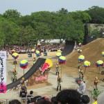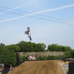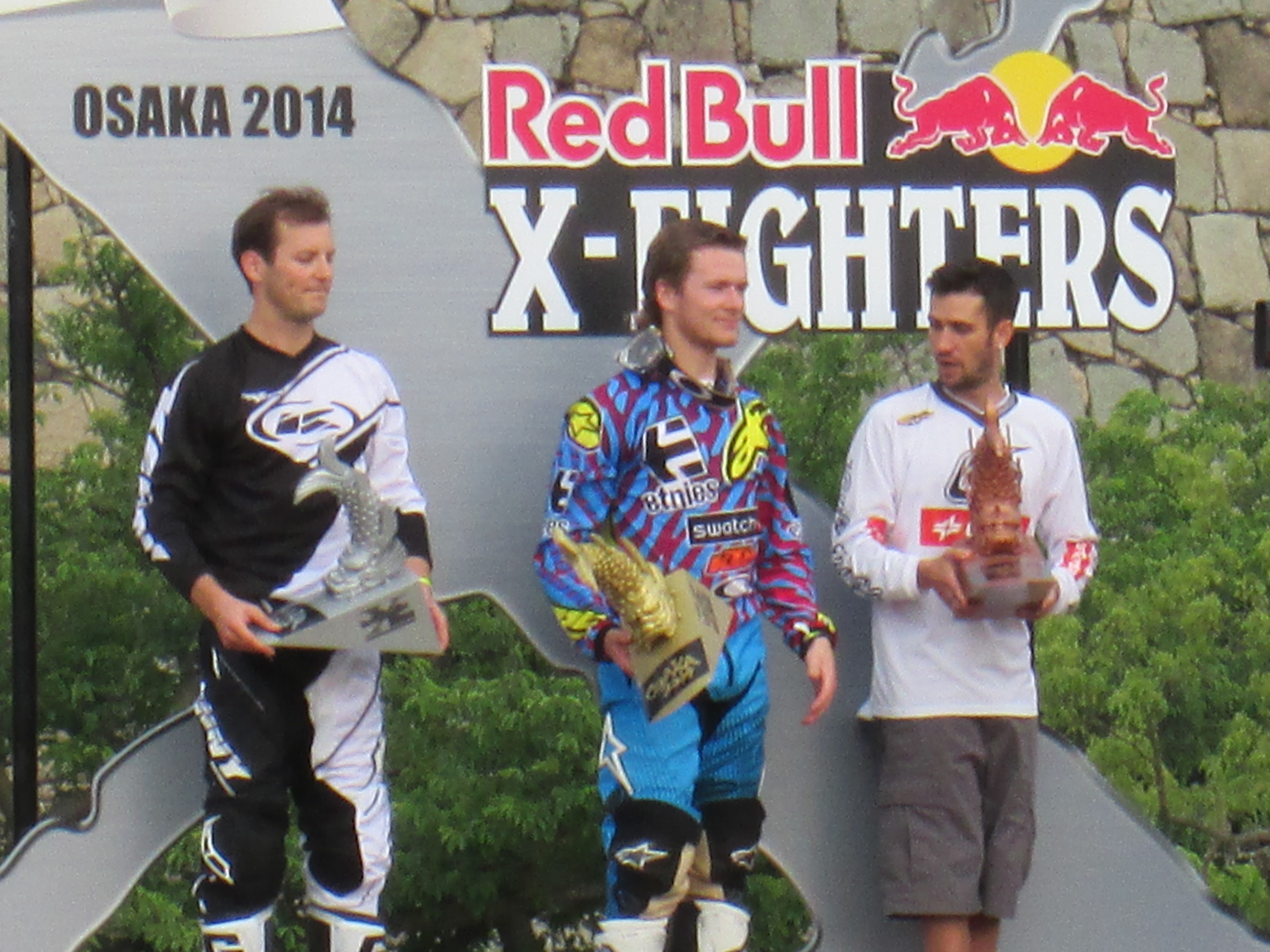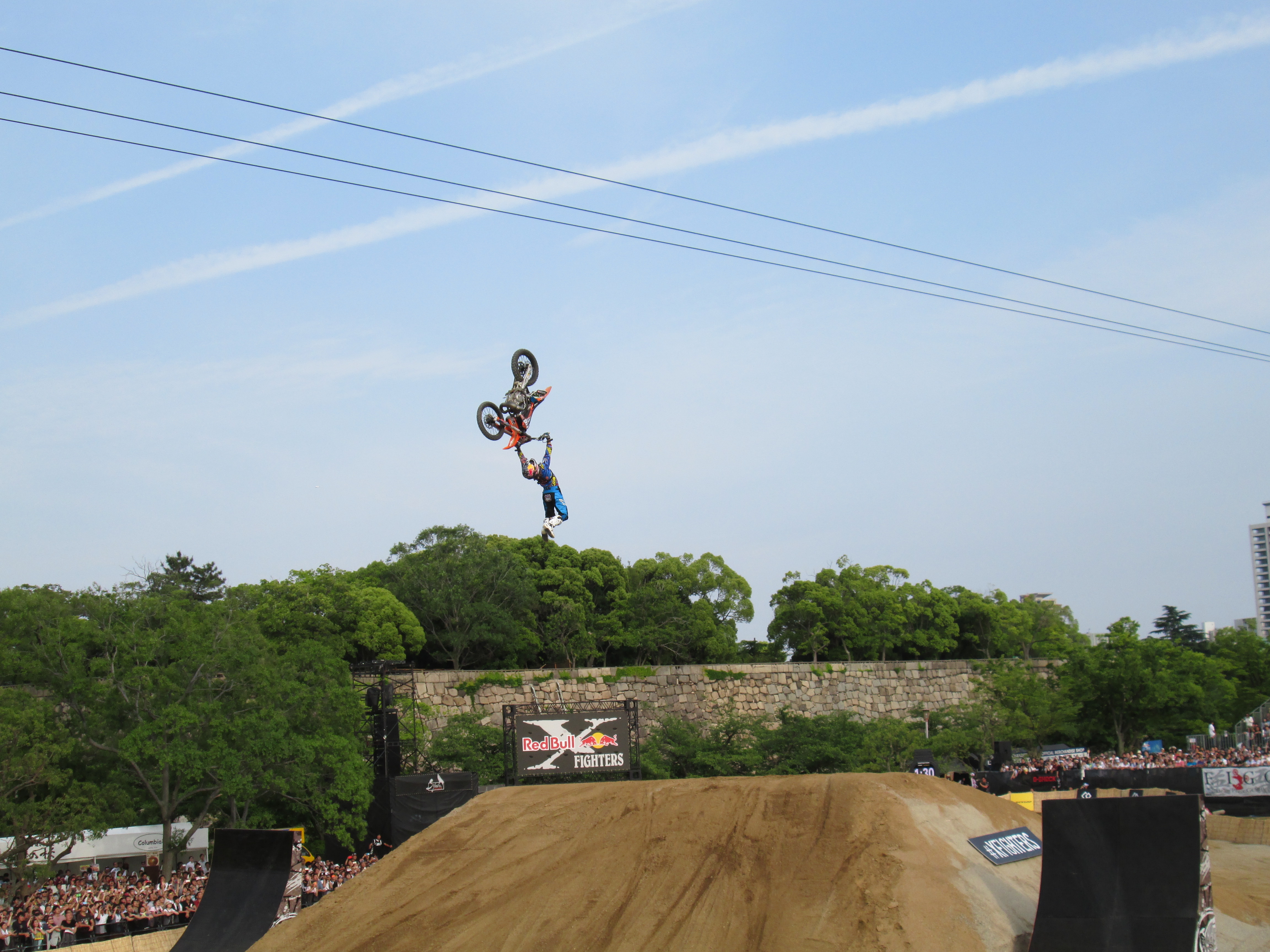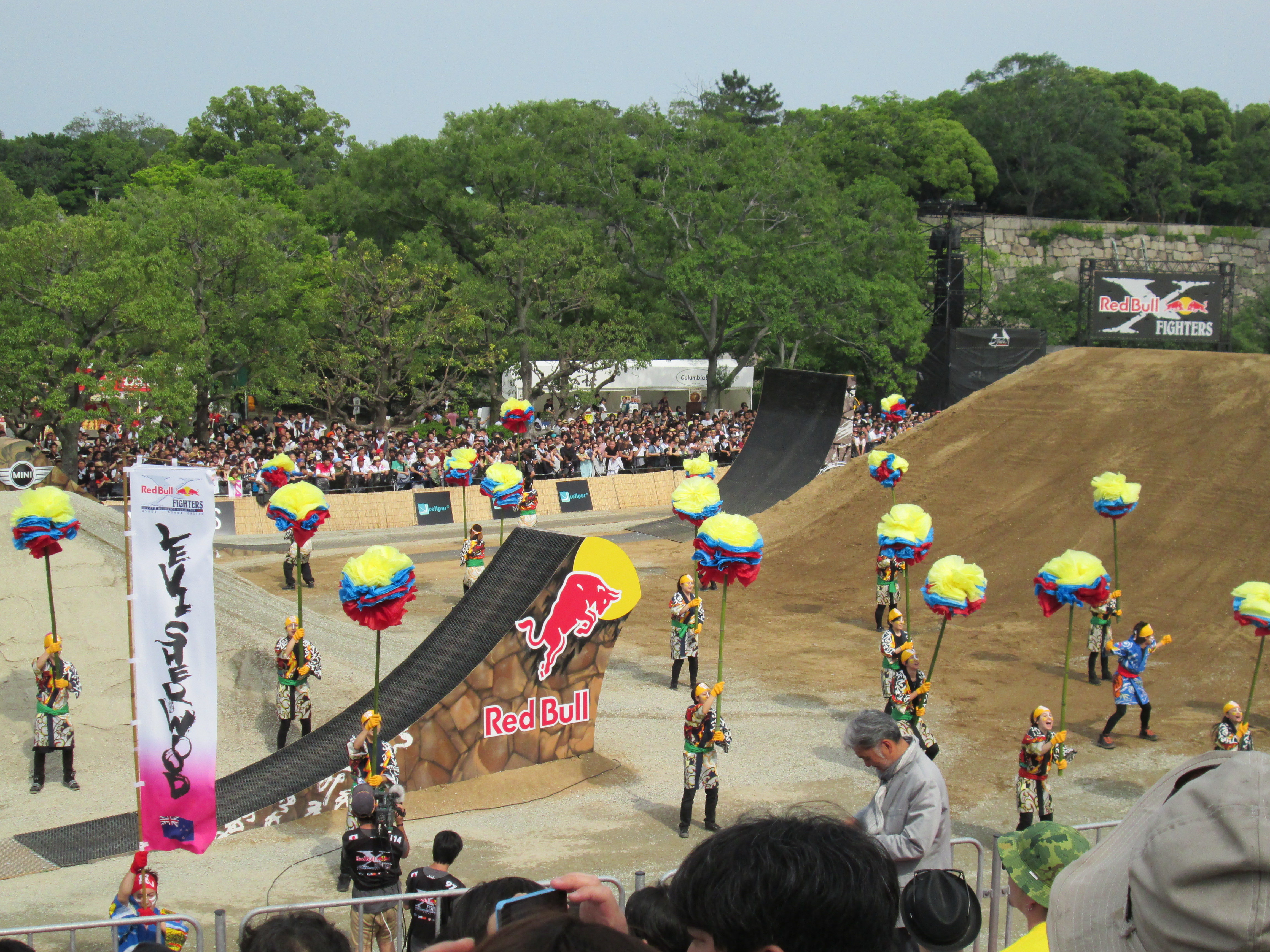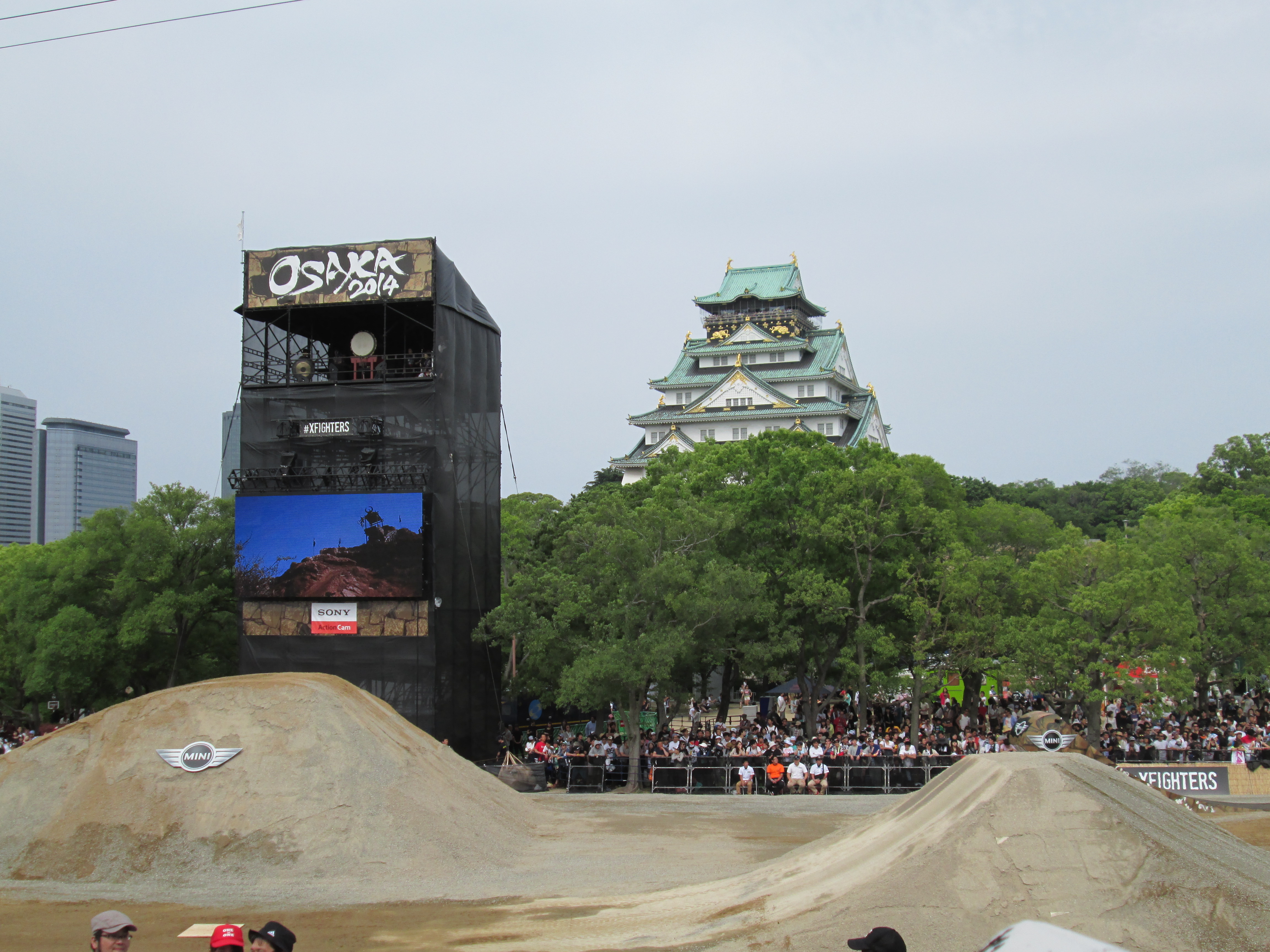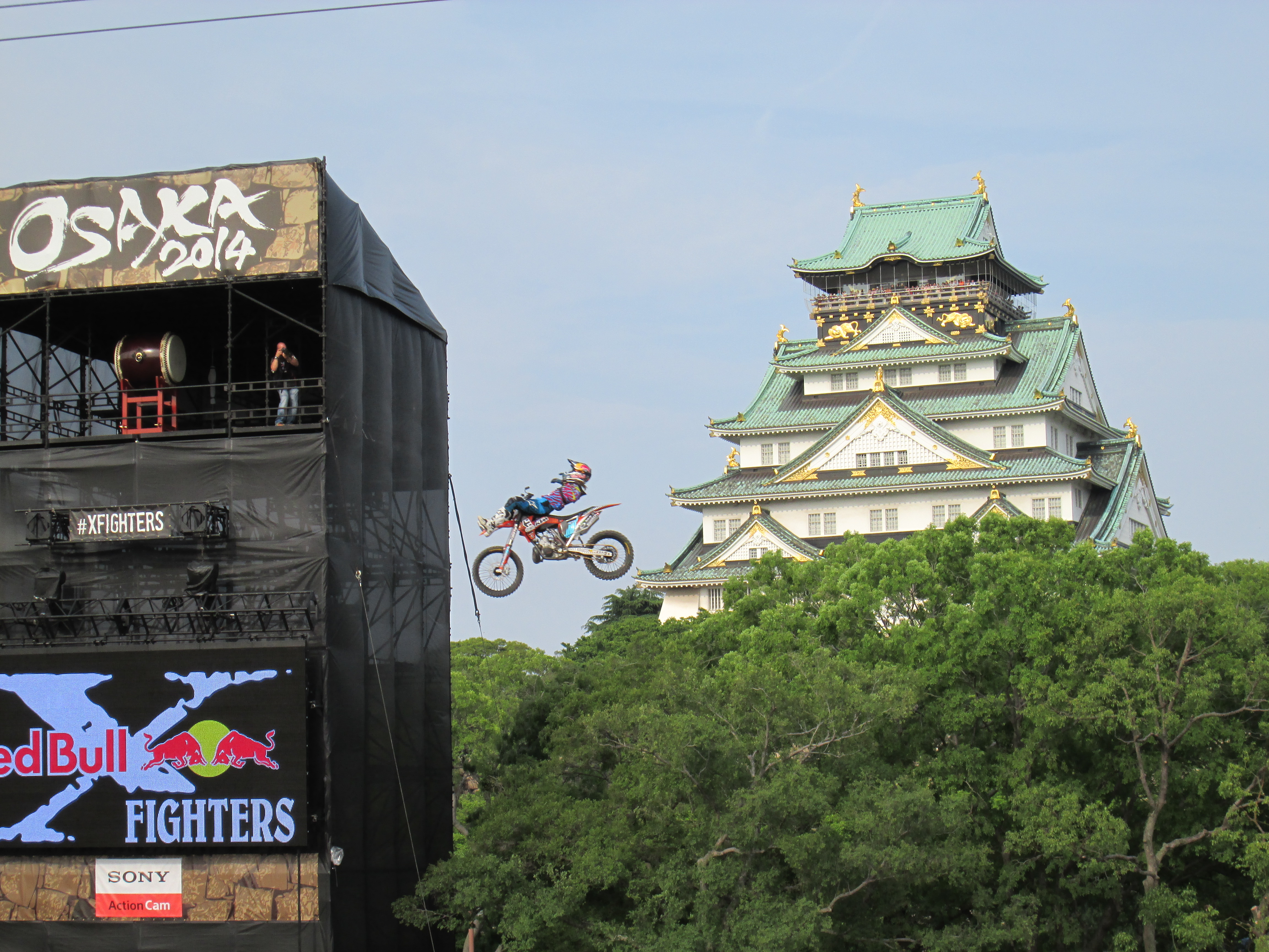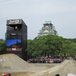 これまで実施された13か国では、スペインの闘牛場、ロシアの赤の広場、エジプトのピラミッドなどが背景に選ばれ、ここ日本では、昨年に続いて大阪城公園西の丸庭園にたくさんの巨大なジャンプ台が作られて、大阪城をバックにライダー達が宙を舞い続けました。