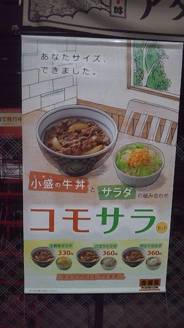 牛丼の小盛とサラダをセットにしたコモサラダも女性客向けで、なかなか良いアイディアだと思います。