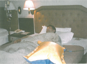(↑筆者点滴中) (黄色の枕のようなものは酸素の入った袋で鼻の穴にチューブを入れます↑)